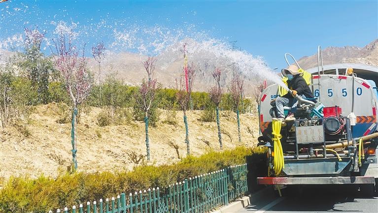 相關(guān)工作人員在為路邊樹(shù)木澆水。 記者 格桑倫珠 實(shí)習(xí)生 達(dá)娃宗巴 攝