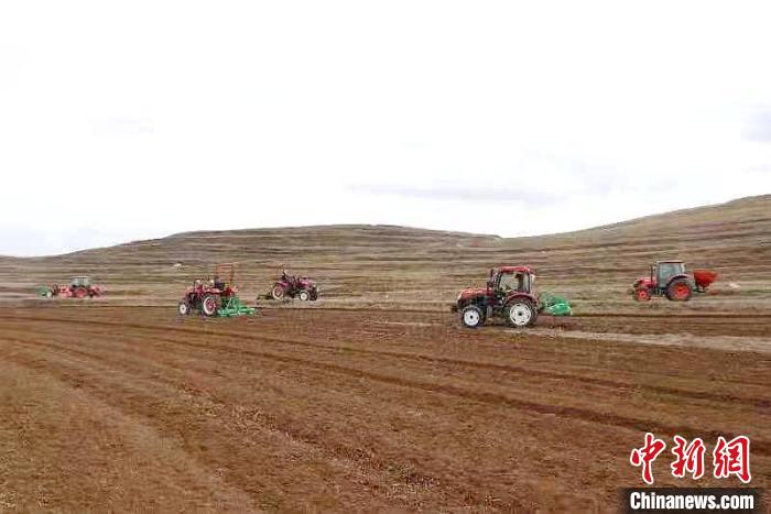 圖為同仁市黃乃亥鄉(xiāng)正在機械化種植黑青稞?!√旖蛟嘀笓]部供圖