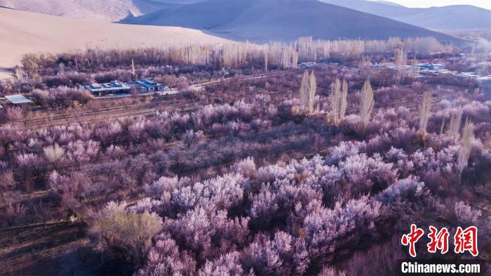 2022年3月30日,航拍敦煌鳴沙山下的李廣杏花海。 王斌銀 攝