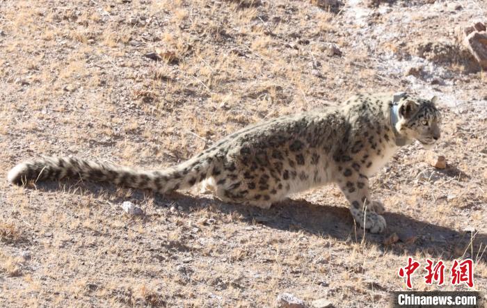 圖為佩戴衛(wèi)星追蹤項(xiàng)圈的雪豹被放歸?!∑钸B山國家公園青海省管理局供圖