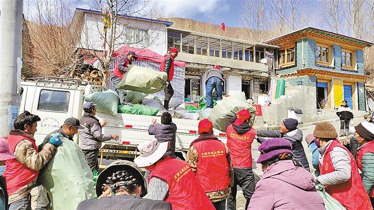 圖為朗縣登木鄉(xiāng)新時代文明實踐志愿者將清理出來的垃圾裝車。記者 史金茹 攝