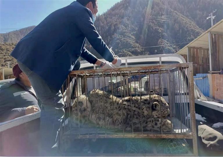 圖為工作人員將雪豹運送至林芝市野生動物收容救護(hù)站。 (西藏自治區(qū)林業(yè)和草原局提供)