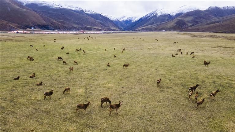 5月21日在類烏齊馬鹿國家級自然保護(hù)區(qū)拍攝的馬鹿(無人機(jī)照片)。新華社記者 周荻瀟 攝