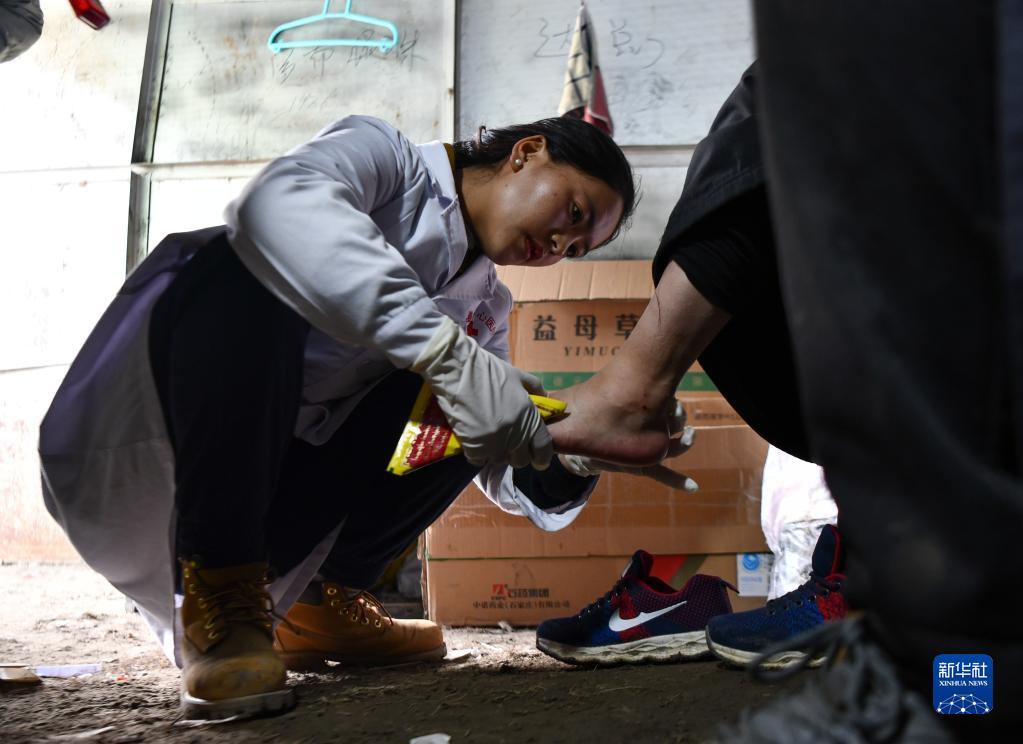 西藏那曲市比如縣良曲鄉(xiāng)然木塘村蟲草采集點的營地里,政府為采集點配備的醫(yī)護人員在給采集蟲草時受傷的牧民治療(5月26日攝)。新華社記者 晉美多吉 攝