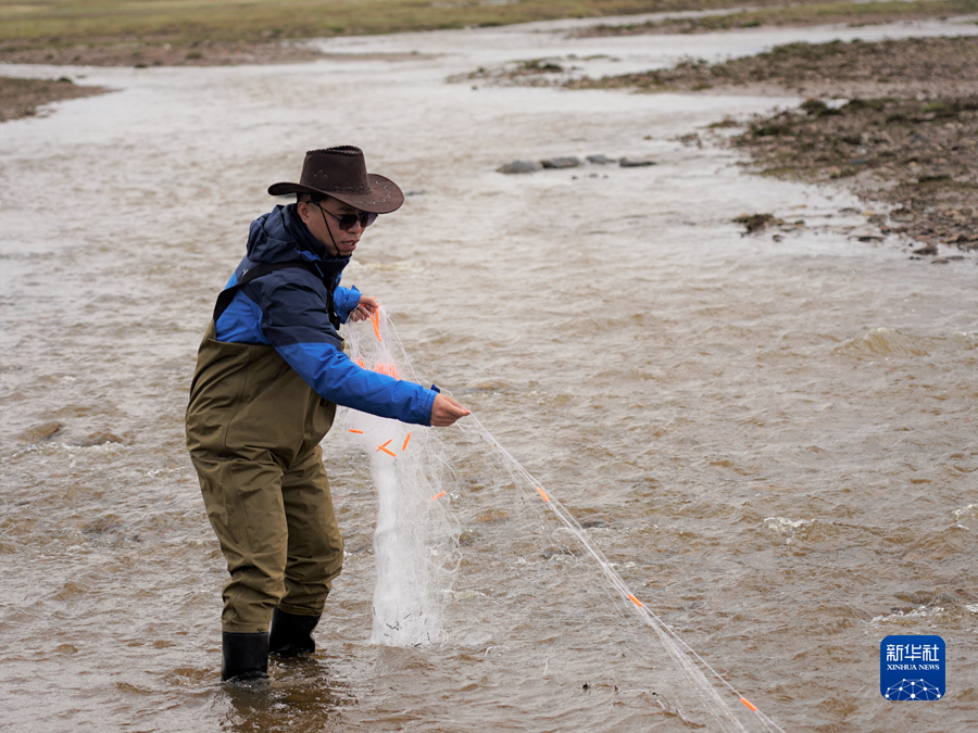 6月12日,李偉在長(zhǎng)江南源當(dāng)曲河畔采集發(fā)育成熟的小頭裸裂尻魚。新華社記者 陳杰 攝