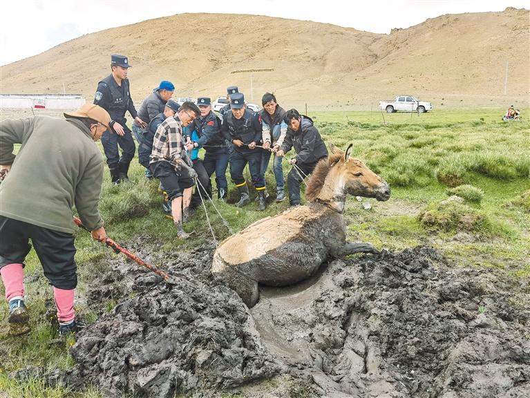 為避免藏野驢因驚嚇而發(fā)生次生傷害或受傷,民警們和圍觀群眾用鐵鍬一點(diǎn)點(diǎn)將周邊的沼澤挖開,使藏野驢的身體完全裸露出泥潭之外,而后用繩分別系住藏野驢的前半身和后半身,一點(diǎn)點(diǎn)向外拖拽,經(jīng)過近2小時(shí)的救助,警民合力將藏野驢成功從沼澤地救出。藏野驢因身體虛弱,休息片刻后才自然起立,歡快地回歸到生活的種群中,民警和救助群眾雖然累得氣喘吁吁,渾身大汗,卻由衷地為藏野驢的平安回歸而露出了喜悅的微笑。