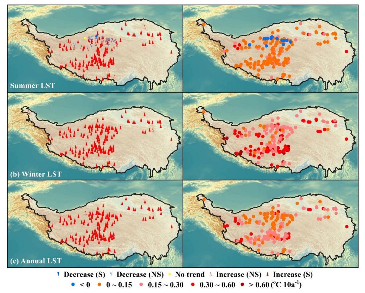基于重建的湖面溫度時間序列,團(tuán)隊揭示了青藏高原湖面溫度的時空演化規(guī)律。研究發(fā)現(xiàn),近40年來(1978—2017年)青藏高原絕大多數(shù)湖泊的表面溫度均呈上升趨勢,升溫速率約每10年0.01~0.47℃,且冬季升溫比夏季更顯著,南部湖泊升溫速率高于北部湖泊。此項研究成果對于未來進(jìn)一步評估氣候變化對青藏高原湖泊水熱收支變化的影響具有重要價值。