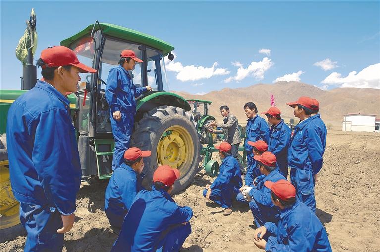 發(fā)展教育脫貧一批。2016年以來,累計落實義務(wù)教育學(xué)?;窘ㄔO(shè)資金84.4億元,實施教育基礎(chǔ)建設(shè)項目1433個,資助建檔立卡和農(nóng)村低保大學(xué)生累計6.06萬人次,落實資助資金3.55億元。圖為西藏自治區(qū)白朗縣邀請山東農(nóng)機(jī)技師對當(dāng)?shù)刎毨糸_展培訓(xùn)。