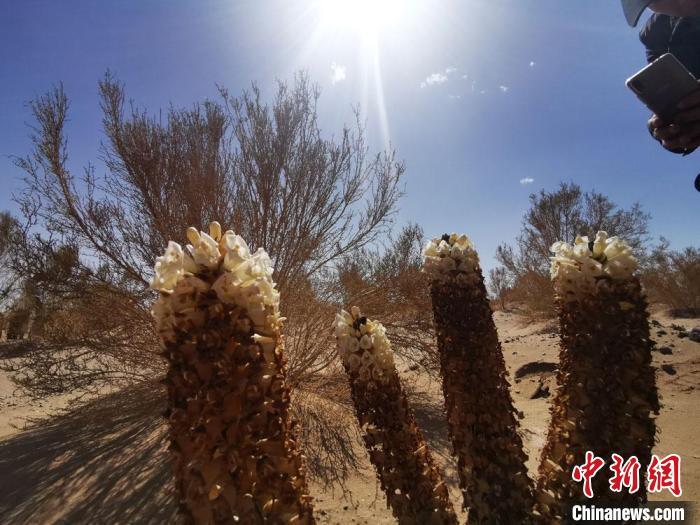 2020年5月16日,甘肅酒泉市金塔縣境內(nèi)沙漠里,梭梭林下的肉蓯蓉花開?!∫蟠河? 攝