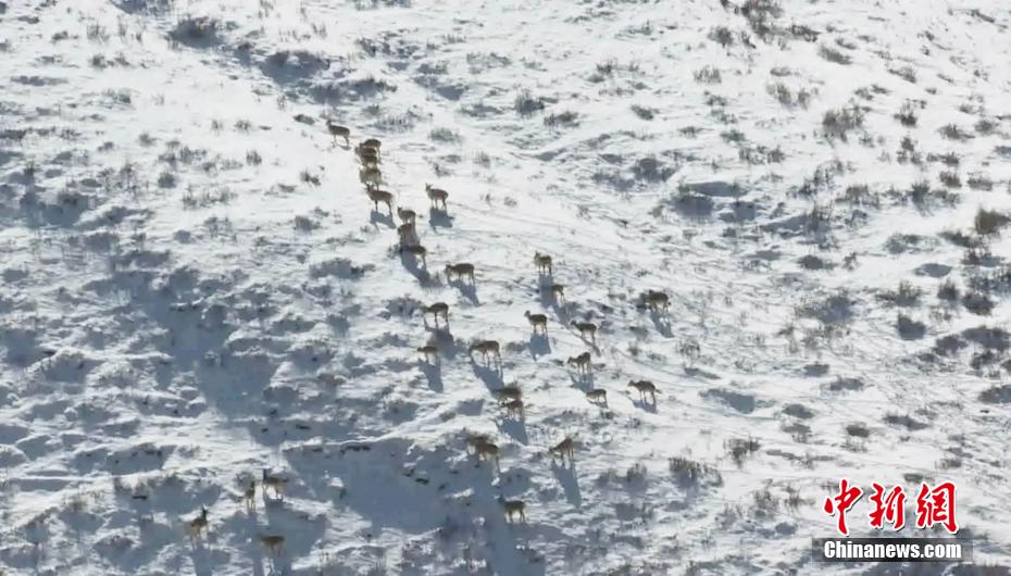 初冬時節(jié),青海省烏蘭縣攝影愛好者在烏蘭縣境內(nèi)發(fā)現(xiàn)近百只巖羊在崖壁間集體覓食,場面壯觀。據(jù)了解,巖羊?qū)賴叶壷攸c保護野生動物,常年生活在海拔2000到3000米的高山裸巖、草甸、山谷之中,具有極高的攀巖技術(shù),被稱為“巖壁上的精靈”。圖為巖羊群在雪地里覓食。 烏蘭縣融媒體中心 供圖
