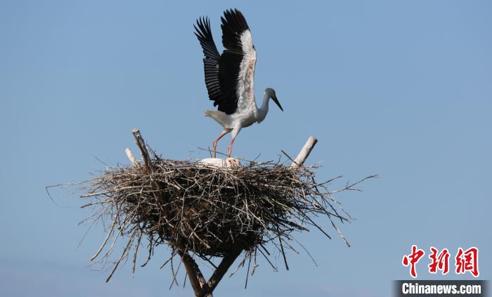 在人工巢內(nèi)的東方白鸛。 黑龍江洪河國(guó)家級(jí)自然保護(hù)區(qū)管理局提供