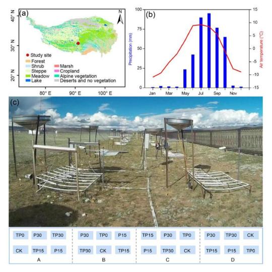 研究站點(diǎn)植被類(lèi)型(a)、氣象條件(b)和實(shí)驗(yàn)設(shè)計(jì)(c)。中科院青藏高原所 供圖
