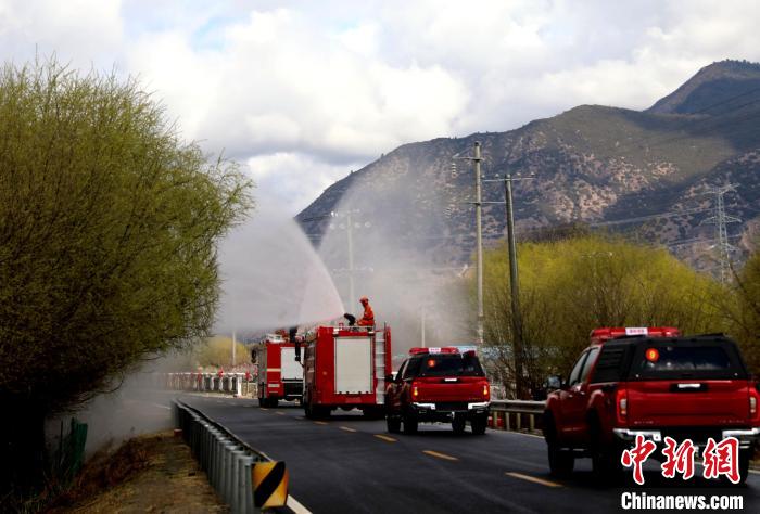 林芝市森林消防支隊消防員正在進行灑水增濕作業(yè)?!∥骼@拉翁 攝
