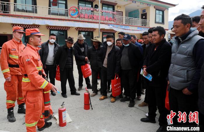 林芝市森林消防支隊指戰(zhàn)員正在講解滅火器的使用方法?!∥骼@拉翁 攝