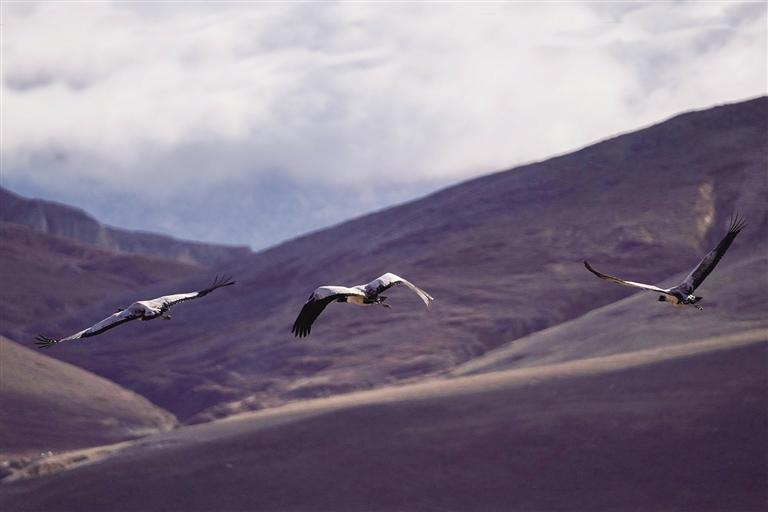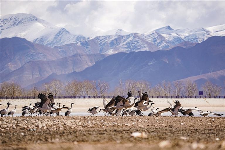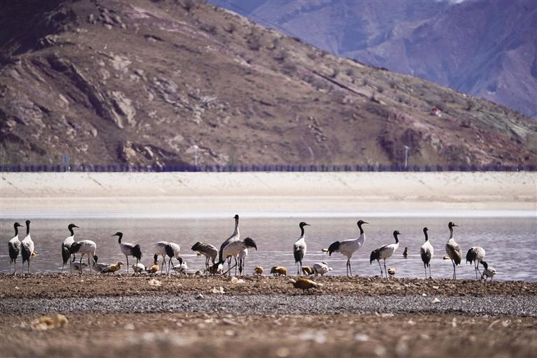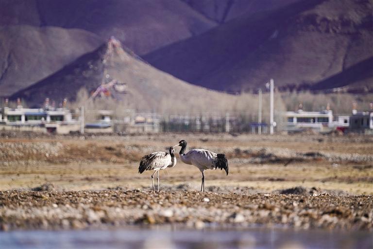 黑頸鶴是國家一級保護(hù)動(dòng)物,在藏語中稱為“沖沖”。主要棲息在海拔2500米至5000米的高原、草甸、沼澤地帶。拉薩北部的林周縣平均海拔約4200米,是黑頸鶴的主要越冬地之一。最近這段時(shí)間,對拉薩市林周縣野保員們來說,一邊要忙自家的農(nóng)活,一邊還要巡查候鳥情況?!耙呀?jīng)有一小部分飛走了,估計(jì)再過半個(gè)月都會(huì)陸續(xù)飛走?!?月23日上午,野保員旦增告訴記者,在虎頭山水庫和卡孜水庫越冬的候鳥有一部分已經(jīng)飛走了。野保員口中的“飛走”便是遷徙,遷徙是候鳥的本能,一年一年,跟隨時(shí)間的召喚,完成兩次遷徙:繁殖和越冬。