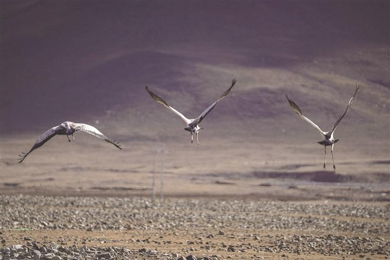 在西藏,黑頸鶴從越冬地到繁殖地有兩條線路:一條是拉薩到色林措,另一條則是從日喀則到色林措。整體來說,是從雅魯藏布江中游河谷黑頸鶴國家級自然保護(hù)區(qū)飛往色林措黑頸鶴保護(hù)區(qū),兩個(gè)保護(hù)區(qū)之間有一條固定的黑頸鶴遷徙路線,每年黑頸鶴會(huì)在3月中旬從越冬地雅江中游河谷及其支流拉薩河、年楚河流域的“一江兩河”地區(qū),飛去羌塘北部草原繁育后代;又會(huì)于11月中旬從繁殖地那曲的班戈縣、申扎縣、嘉黎縣,阿里的日土縣、普蘭縣,日喀則的昂仁縣,拉薩的當(dāng)雄縣返回到越冬地。對于雅江中游河谷來說,它是冬候鳥;對于羌塘北部草原來說,它是夏候鳥。