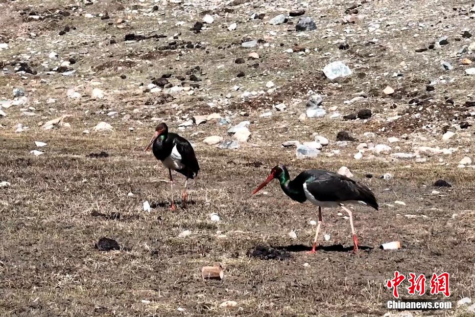 近日,攝影師在位于祁連山國(guó)家公園青海片區(qū)的青海省海北藏族自治州祁連縣阿柔鄉(xiāng)境內(nèi)拍攝到兩只黑鸛愜意覓食、翱翔。