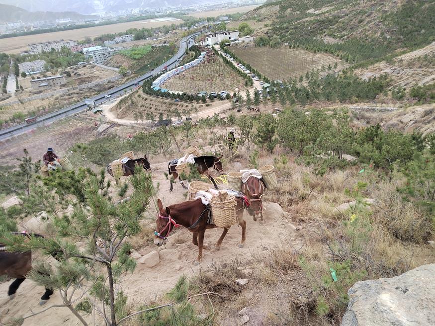 圖為騾隊在綠化片區(qū)運輸樹苗 圖片來源:西藏自治區(qū)慈善總會官網