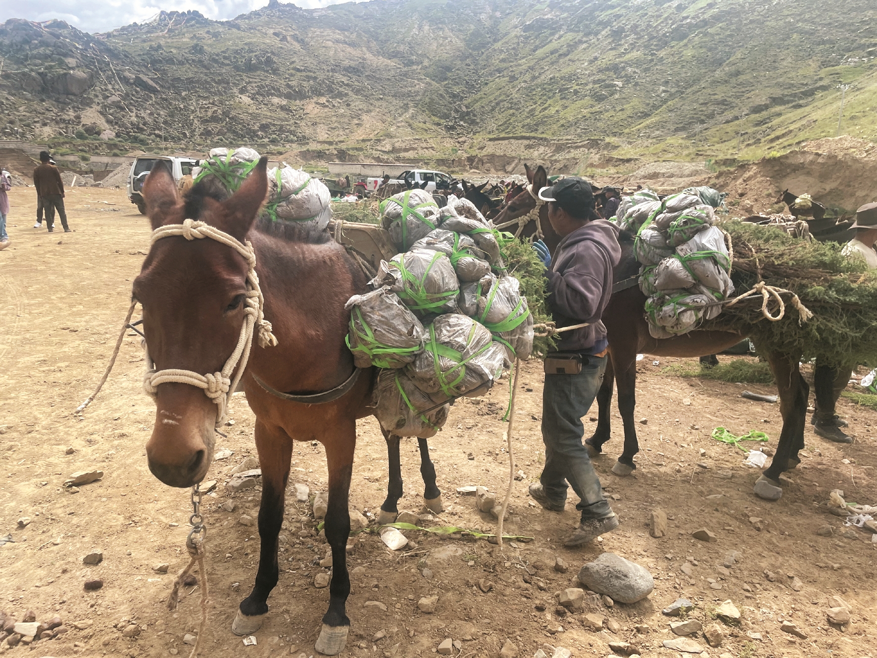 在堆龍德慶區(qū)乃瓊鎮(zhèn)色瑪造林片區(qū),植樹(shù)造林面積有4876.2畝,種植沙棘、祁連圓柏、油松等苗木共計(jì)58.79萬(wàn)株。該植樹(shù)造林點(diǎn)位于山頂,山路陡峭,為了將苗木運(yùn)送上山,施工單位雇傭了群眾騾馬隊(duì),每天保障100匹騾馬幫助運(yùn)送苗木。施工現(xiàn)場(chǎng),騾馬隊(duì)按規(guī)范將苗木進(jìn)行分裝,每匹騾馬分裝苗木10余株,運(yùn)送上山后由工人栽種。騾馬隊(duì)每天能運(yùn)送苗木5000株。