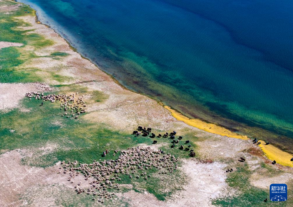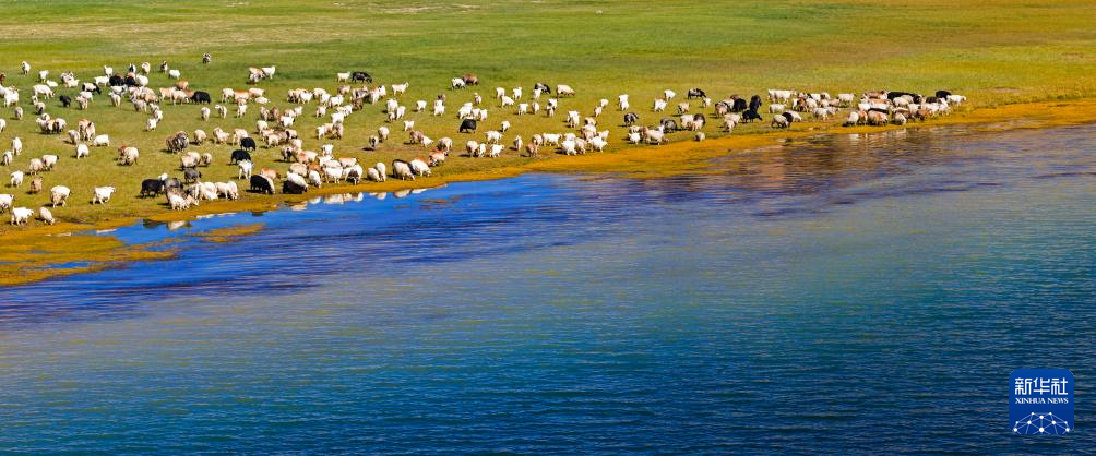 羊群在班公湖畔飲水(無人機(jī)照片,9月21日攝)。新華社記者 姜帆 攝