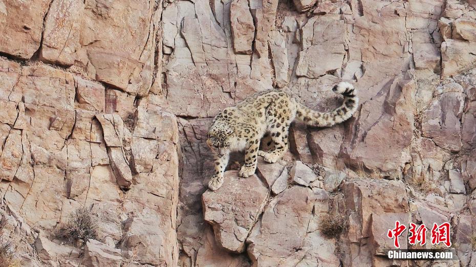 近日,攝影師在位于祁連山南麓的青海省海西蒙古族藏族自治州天峻縣蘇里鄉(xiāng)曲尕追村境內(nèi),拍攝到雪豹的高清畫(huà)面。畫(huà)面中,一只雪豹從懸崖峭壁之上踏石而下,步履矯健。雪豹是青藏高原旗艦物種,處于食物鏈頂端,國(guó)家一級(jí)保護(hù)野生動(dòng)物,被稱(chēng)為“雪山之王”。據(jù)了解,雪豹喜好干燥涼爽、多裸巖的陡峭山區(qū),除了繁殖期一般都是單獨(dú)行動(dòng)。近年來(lái),祁連山自然生態(tài)系統(tǒng)穩(wěn)定性和循環(huán)能力全面提升,生物多樣性保護(hù)得到加強(qiáng)。當(dāng)?shù)匾讯啻闻臄z到雪豹活動(dòng)的場(chǎng)景。圖為雪豹在懸崖峭壁間游走。