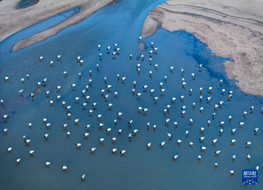 這是在拉薩市林周縣虎頭山水庫拍攝的越冬黑頸鶴(10月24日攝,無人機(jī)照片)。新華社記者 姜帆 攝