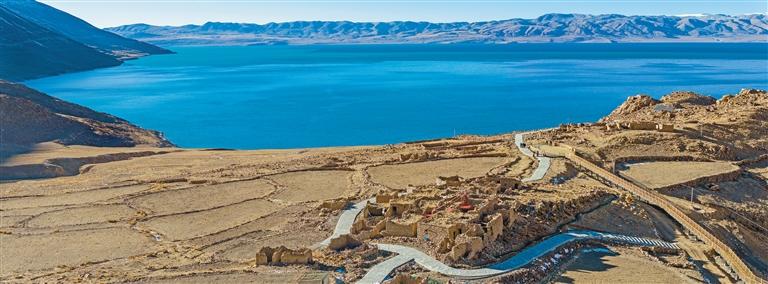 在當(dāng)惹雍錯(cuò)湖畔,尼瑪縣甲谷鄉(xiāng)吉松村剛剛竣工的棧道和觀景臺(tái)(無(wú)人機(jī)照片)。新華社記者 格桑朗杰 攝