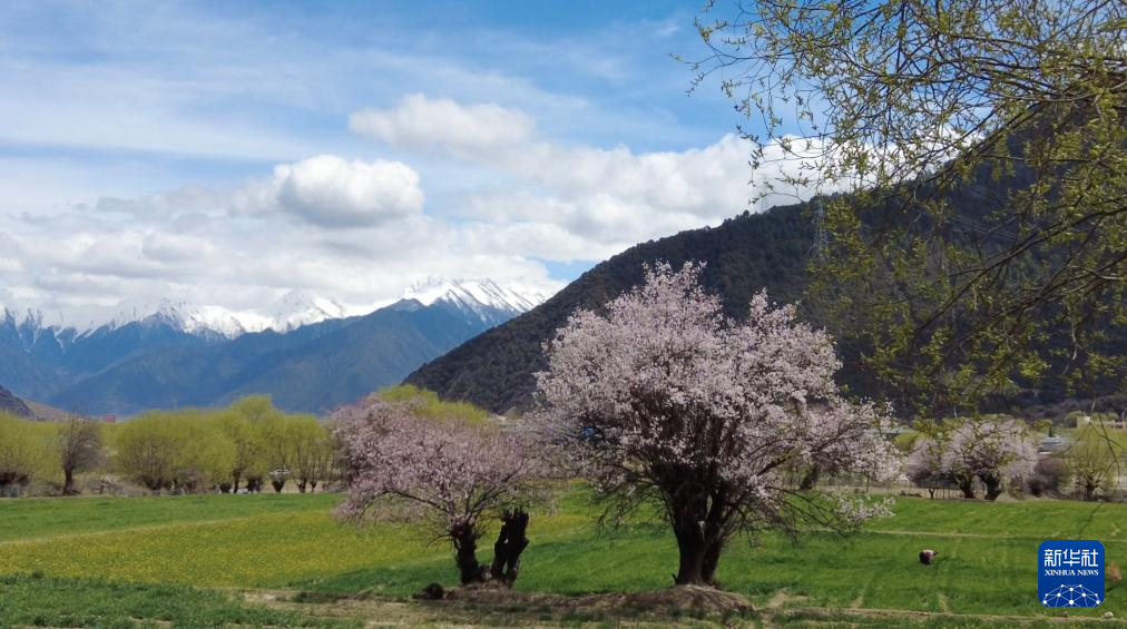 燦若云霞的桃花和潔白無瑕的雪山交織成一幅獨特的雪域高原美景(3月30日攝)。新華社記者 丁增尼達 攝