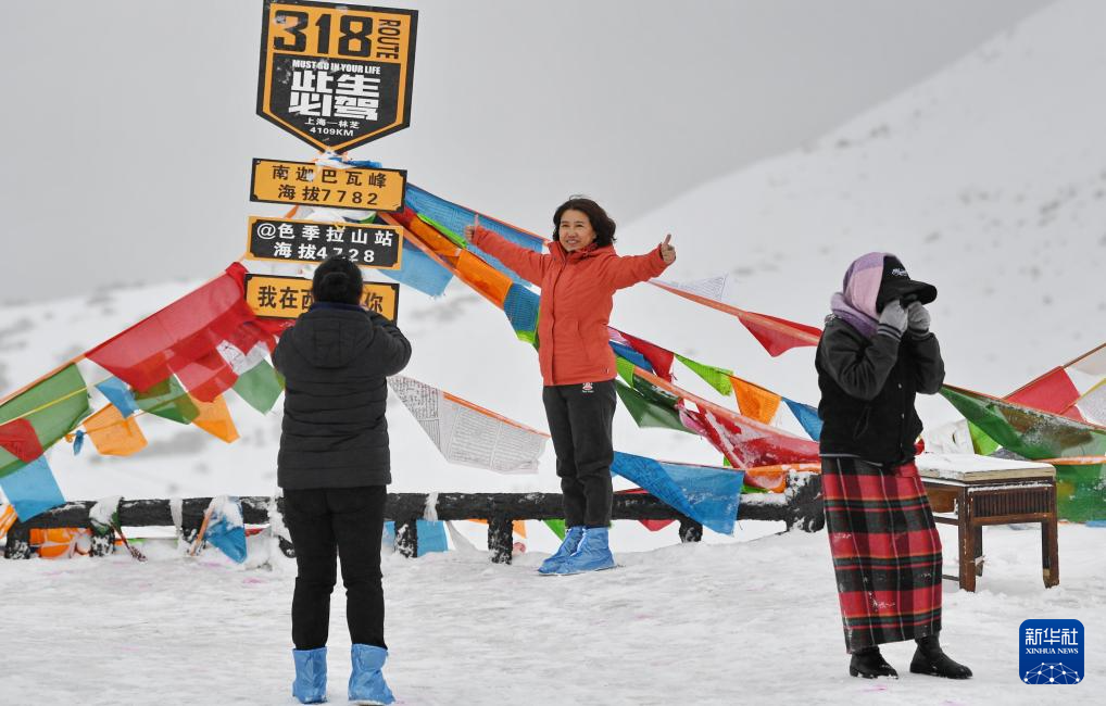 游客在林芝市色季拉山觀景臺(tái)拍照留影(4月19日攝)。新華社記者 張汝鋒 攝