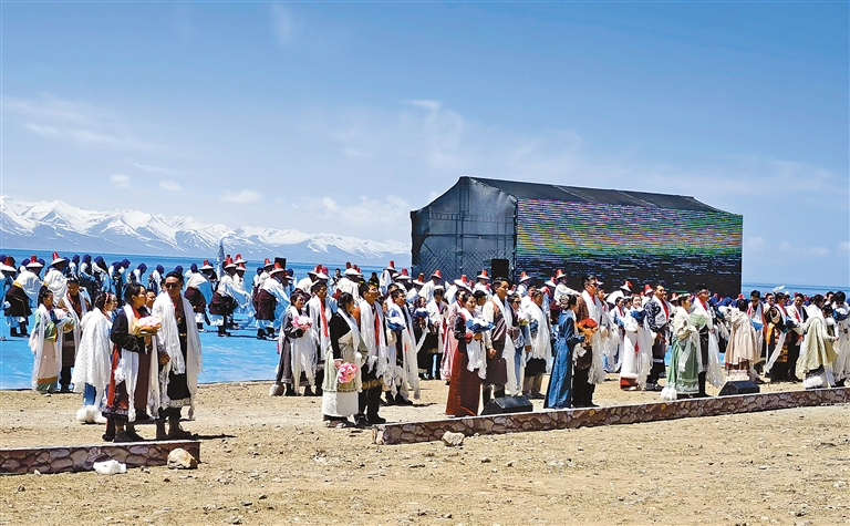 太陽漸漸升起,納木錯(cuò)的昏黃一掃而空,一切都明朗起來,巍巍的雪山環(huán)抱著蔚藍(lán)的湖水,大千世界都映襯在水中。在以“情定納木錯(cuò)·百年永相守”為主題的藏式婚禮,伴隨著音樂,99對新人手捧鮮花,穿過喜門入場,在藏族歌手和舞者的引領(lǐng)下緩緩步入婚禮現(xiàn)場。悠揚(yáng)動(dòng)聽的牧區(qū)山歌以對唱的形式講述念青唐古拉山和納木錯(cuò)的浪漫愛情故事,接受祝福、宣讀誓言、互換信物,身著藏袍的新人們臉上充滿喜悅和期待,巍峨雪山見證新人們彼此一生中最重要的承諾。
