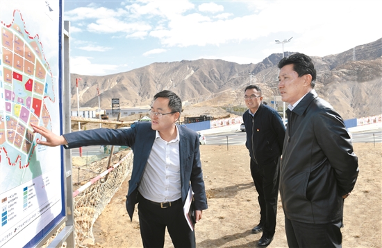 4月16日上午,市委副書記、市長、城關(guān)區(qū)委書記果果調(diào)研拉薩高新區(qū)部分在建項目進展情況。圖為果果在施工現(xiàn)場查看工程效果圖、聽取拉薩高新區(qū)負(fù)責(zé)人的匯報。拉薩融媒記者 巴桑次仁攝