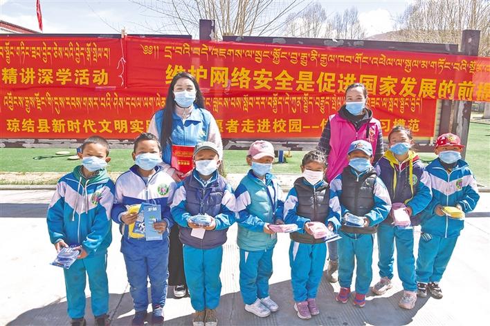 志愿者向瓊結(jié)鎮(zhèn)小學(xué)學(xué)生發(fā)放學(xué)習(xí)用具,開展“綠書簽”活動(dòng)。記者 洛桑 次旺 攝