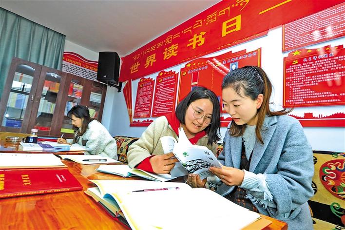 拉薩市墨竹工卡縣教育局干部職工在黨員活動(dòng)室內(nèi)閱讀圖書。洛克 記者 唐斌 攝