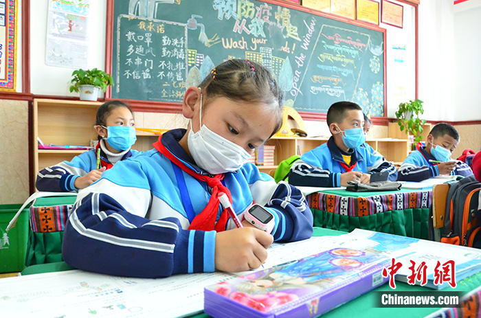4月15日,玉樹市第三完全小學(xué)的學(xué)生在課堂上做筆記。中新社記者 魯?shù)り?yáng) 攝