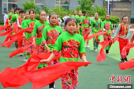 圖為化隆縣第一小學的學生們正在跳《民族大團結》(左前一是李貴蘭)?!◆?shù)り?攝
