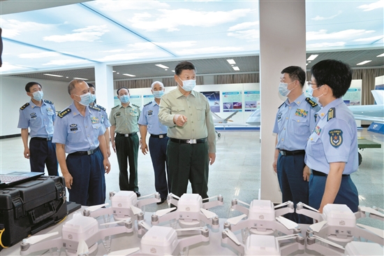 八一建軍節(jié)到來(lái)之際,中共中央總書(shū)記、國(guó)家主席、中央軍委主席習(xí)近平7月23日到空軍航空大學(xué)視察,代表黨中央和中央軍委,向?qū)W校師生員工致以誠(chéng)摯問(wèn)候,向全體人民解放軍指戰(zhàn)員、武警部隊(duì)官兵、民兵預(yù)備役人員致以節(jié)日祝賀。這是習(xí)近平察看無(wú)人機(jī)操控教學(xué)設(shè)施,了解無(wú)人機(jī)操控員培養(yǎng)情況。新華社記者 李剛攝