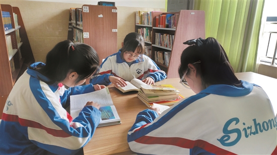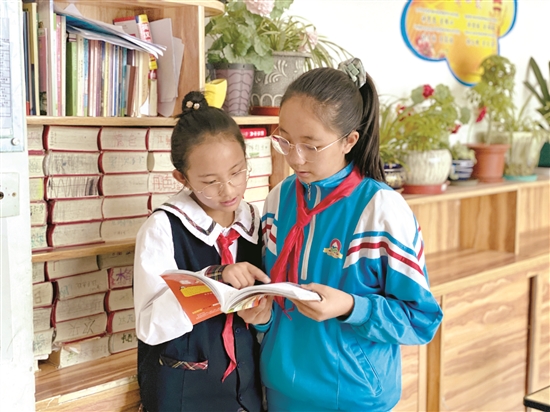 圖為課外時(shí)間,貢吉(左)與好朋友分享閱讀過程中看到的經(jīng)典語句。 拉薩融媒記者 靳敏攝