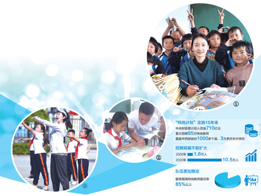 農(nóng)村義務(wù)教育階段學(xué)校教師特設(shè)崗位計(jì)劃(簡(jiǎn)稱“特崗計(jì)劃”)始于2006年,每年公開招考選聘數(shù)萬名高校畢業(yè)生到中西部貧困縣農(nóng)村學(xué)校任教。[詳細(xì)] -