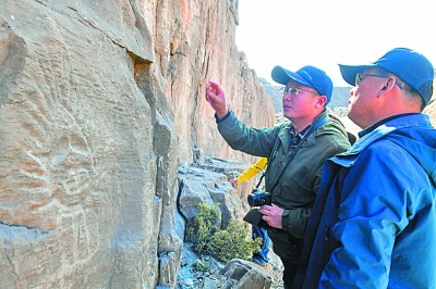 考古專家在內蒙古桌子山巖畫群中的摩爾溝巖畫前研討。新華社發(fā)