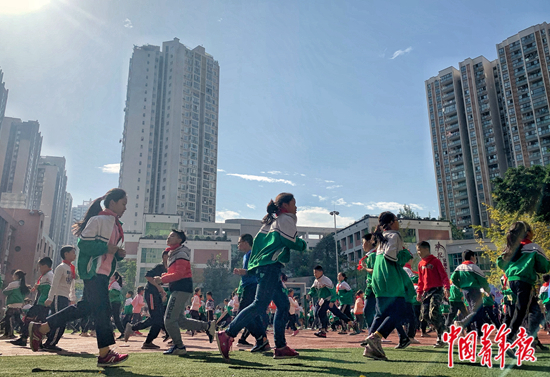 四川成都電子科技大學附屬實驗小學的學生在進行體育鍛煉。梁璇/攝