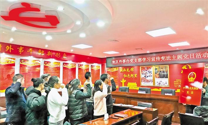 地區(qū)外事辦黨支部組織黨員干部在機(jī)關(guān)活動場所舉辦學(xué)習(xí)宣傳憲法主題黨日活動。