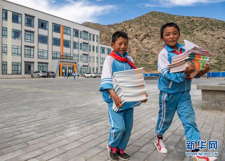 在山南市貢嘎縣森布日幸福家園九年一貫制學(xué)校,剛開(kāi)學(xué)的孩子們搬新書(shū)(8月24日攝)。新華社記者 孫非 攝