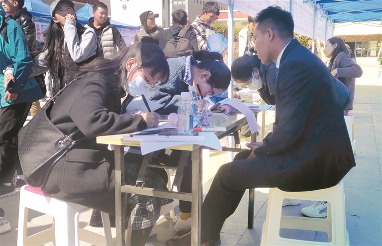 拉巴占堆是西藏大學(xué)藏語(yǔ)言文學(xué)師范專(zhuān)業(yè)的一名大四畢業(yè)生,他曾在拉薩北京實(shí)驗(yàn)中學(xué)實(shí)習(xí)過(guò),對(duì)教育工作充滿熱情。招聘會(huì)現(xiàn)場(chǎng),他向卓夢(mèng)培訓(xùn)等教育相關(guān)企業(yè)都投遞了簡(jiǎn)歷?!拔彝读藥追莺?jiǎn)歷了,希望能夠找到和自己專(zhuān)業(yè)相關(guān)的工作,實(shí)現(xiàn)自己的價(jià)值?!崩驼级颜f(shuō)。