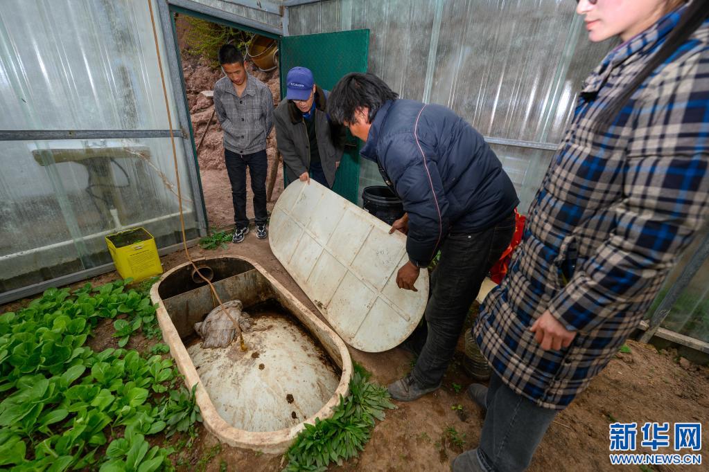 5月2日,在西藏昌都市類烏齊縣濱達鄉(xiāng)濱達村,李純民(左二)在當地村民向巴巴登(右二)家中查看沼氣罐的使用情況。新華社記者 劉金海 攝