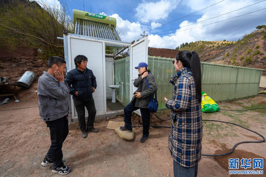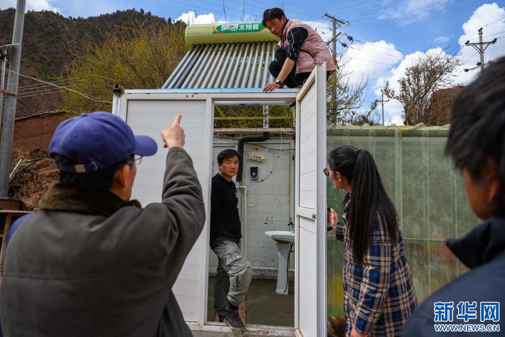 5月2日,李純民趕到西藏昌都市類烏齊縣濱達鄉(xiāng)濱達村,為當地村民向巴巴登協(xié)調太陽能熱水器的安裝調試工作。這是李純民(右二)通過濱達鄉(xiāng)小學老師索朗卓瑪(右一)作藏語翻譯,就熱水淋浴室與水沖廁整體改造計劃給向巴巴登(左二)提出建議。新華社記者 劉金海 攝