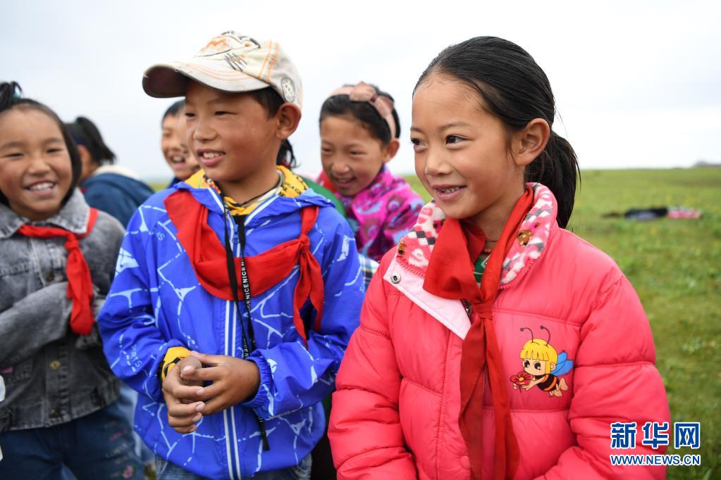 7月14日,河曲馬場(chǎng)小學(xué)的孩子在草原上唱歌。新華社記者 杜哲宇 攝