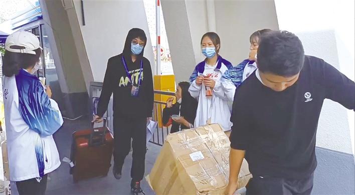 據(jù)迎新工作人員介紹,新生入校后,黨員志愿服務(wù)隊(duì)會(huì)對(duì)新生進(jìn)行身份核驗(yàn)、測體溫,學(xué)生志愿服務(wù)隊(duì)會(huì)幫新生將行李搬運(yùn)至新生報(bào)到處,新生在報(bào)到處辦理好入學(xué)手續(xù)后,志愿服務(wù)隊(duì)的工作人員還會(huì)負(fù)責(zé)將學(xué)生行李搬運(yùn)至新生宿舍。