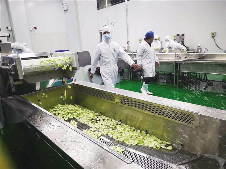 隨后,記者來(lái)到了素菜初加工車(chē)間,這里有很多設(shè)備,洗凈的一筐青筍條通過(guò)其中一個(gè)小設(shè)備后,兩分鐘全部變成了青筍丁,洗凈的菜瓜通過(guò)一條切片的生產(chǎn)線后立即變成了小的塊狀,經(jīng)過(guò)保食安專業(yè)食品凈化工業(yè)機(jī)后,直接回收到盛菜的框里。在葷菜初加工車(chē)間,工作人員把雞蛋放入水池中消毒清洗,將洗凈的雞脯肉放入切丁機(jī)中進(jìn)行分切,一兩分鐘雞脯肉就變成了肉丁。