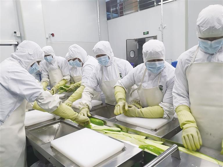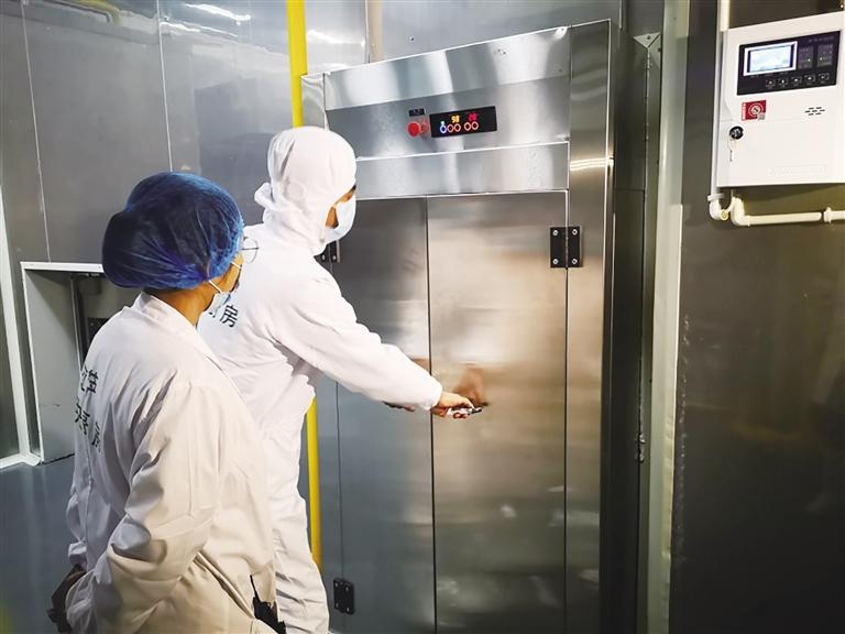 通過(guò)員工通道,在該廚房生產(chǎn)廠長(zhǎng)甘文忠的指導(dǎo)下,記者穿上了白色工作服、戴上食品安全帽,換上高筒膠鞋,洗手消毒、測(cè)量體溫、隨身攜帶的手機(jī)、首飾全部摘掉后,通過(guò)腳踏池進(jìn)入生產(chǎn)加工車(chē)間。
