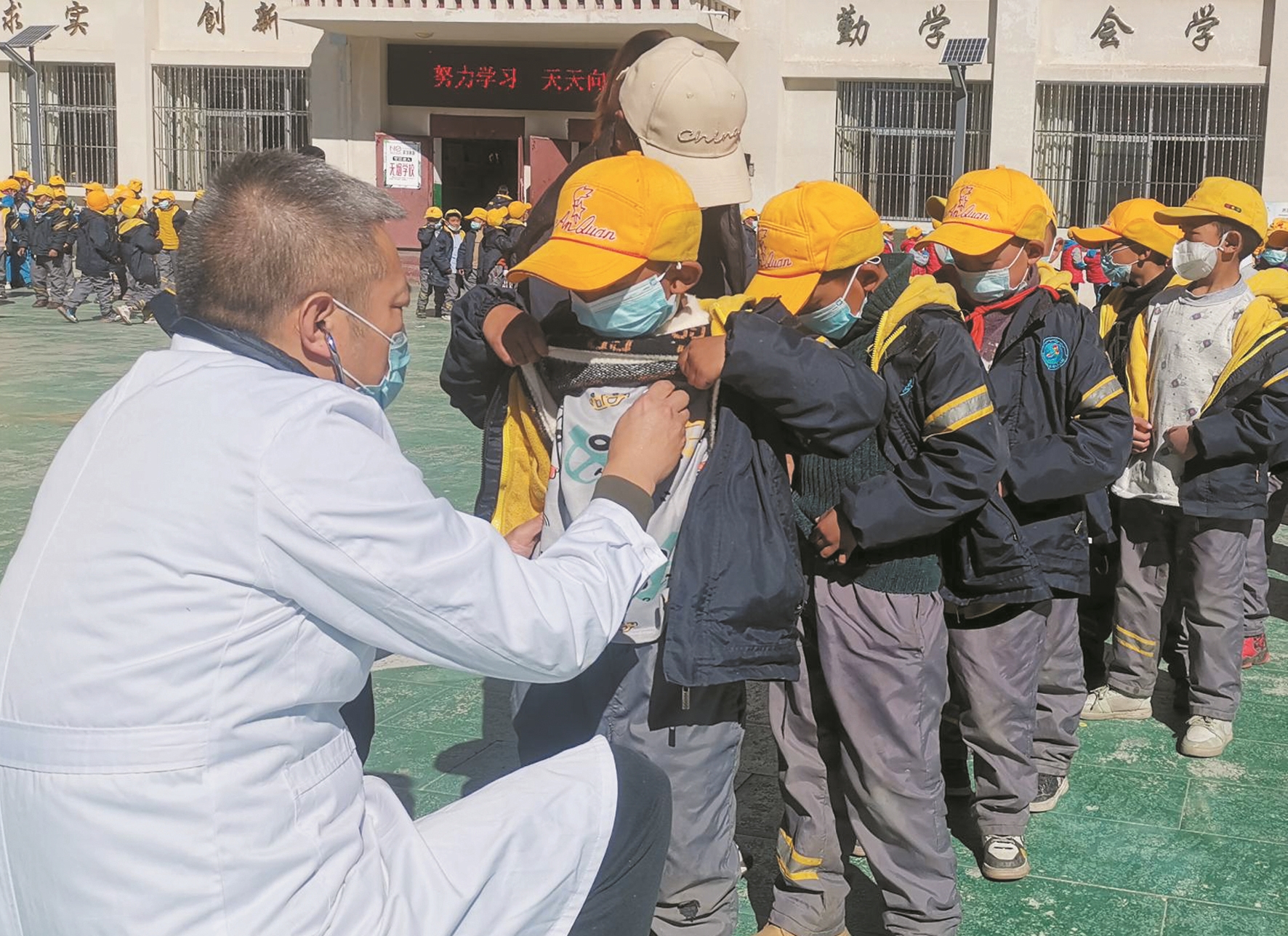 圖為醫(yī)療專家為墨竹工卡縣尼瑪江熱鄉(xiāng)小學(xué)的學(xué)生進行聽診器檢查。拉薩融媒記者 白 央攝